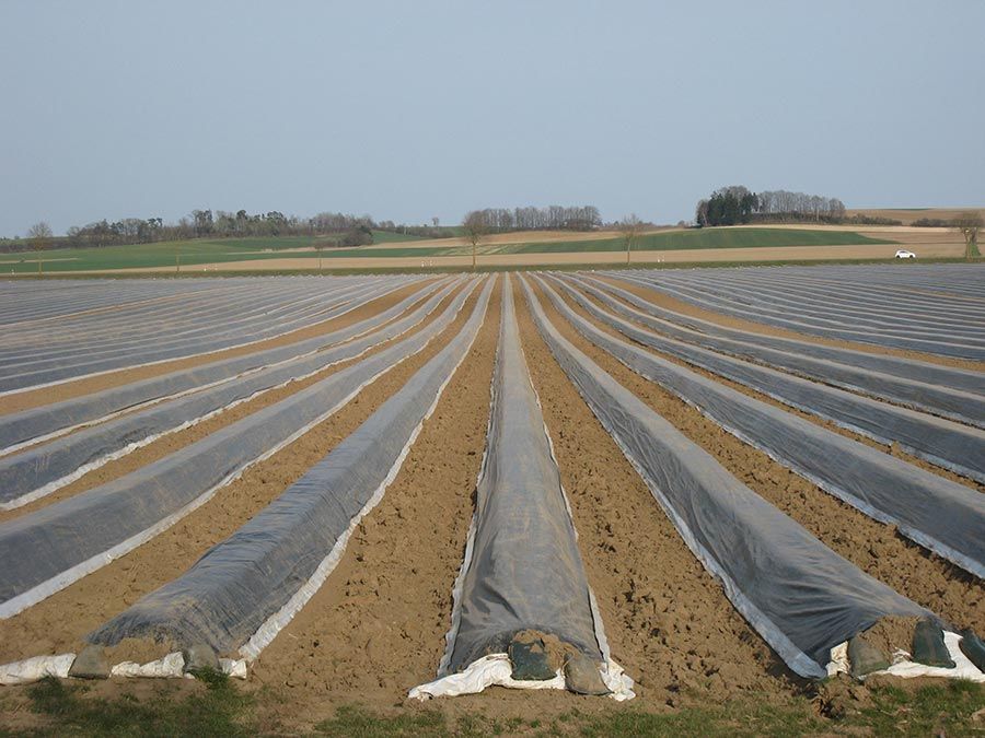 Im ersten Jahr sind die Junganlagen noch zu schwach und können daher noch nicht gestochen werden. Im nächsten Jahr werden mithilfe von Spargeldammfräsen Erddämme über die Pflanzen errichtet.